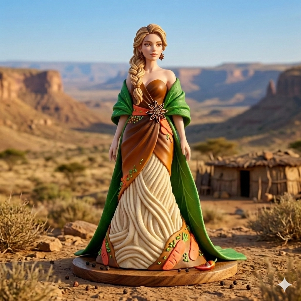 幫我生成公仔的圖片把他擬人化把碗裡所有的顏色按照比例生成晚禮服人物要是女的背景是東非大裂谷要是白人