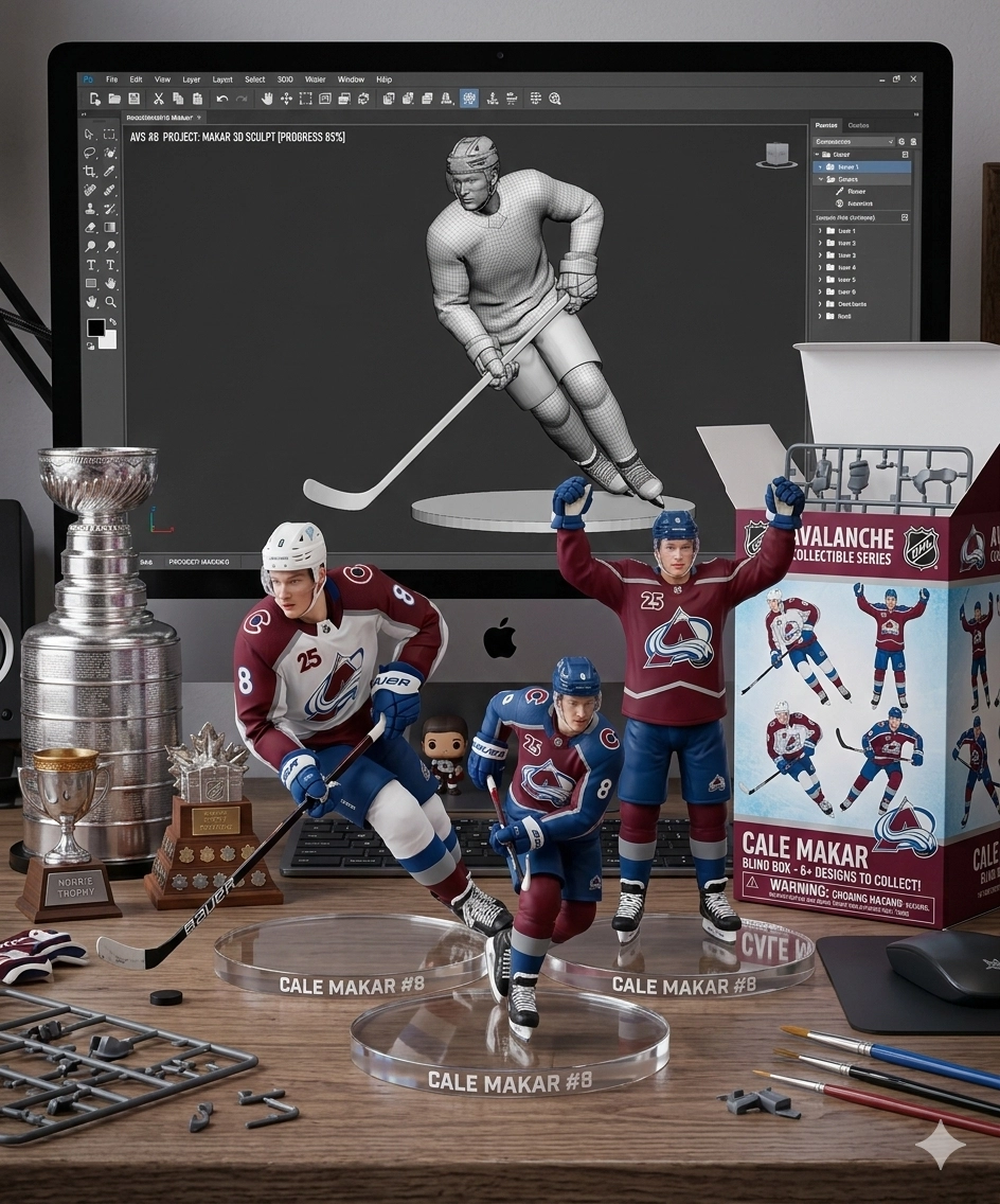 場景為一張電腦書桌,上面擺放著幾個1/7 比例的 PVC 公仔,角色以圖中的Cale Makar 為主,呈現不同動作(類似盲盒有多種款式),並固定在透明圓形底座上,呈現出細緻逼真的動漫風格收藏品質感。