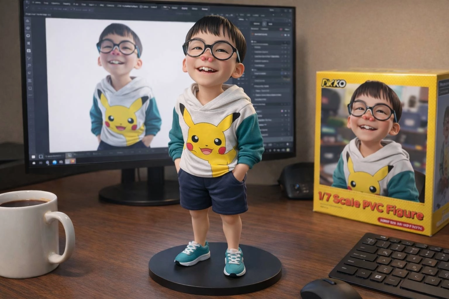 請用我提供的圖片,把圖片內的弟弟變 成電腦桌前的立體公仔,整張圖片請以橫向 構圖。