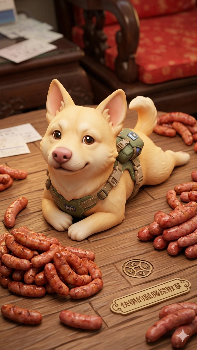 請幫我依照圖片這隻狗做一隻3D公仔,小狗要趴在地上並且可愛一點,然後他的身邊要很多香腸