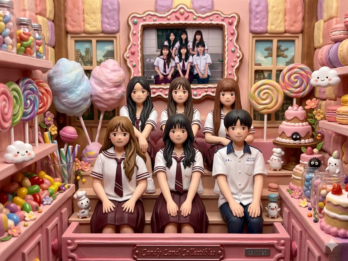 幫我用這張照片生成公仔背景要在可愛的粉紅色夢幻糖果屋裡面牆壁上還要掛我們六個的合照