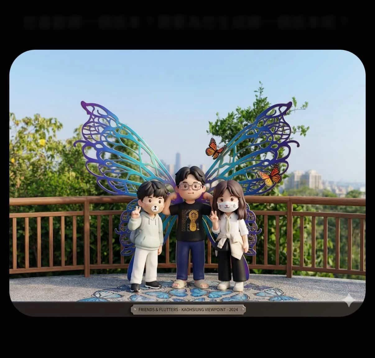幫我生成公仔版本要有一點點可愛然後背景要留可以生成多種版本背後的白色蝴蝶改成其他蝴蝶的顏色