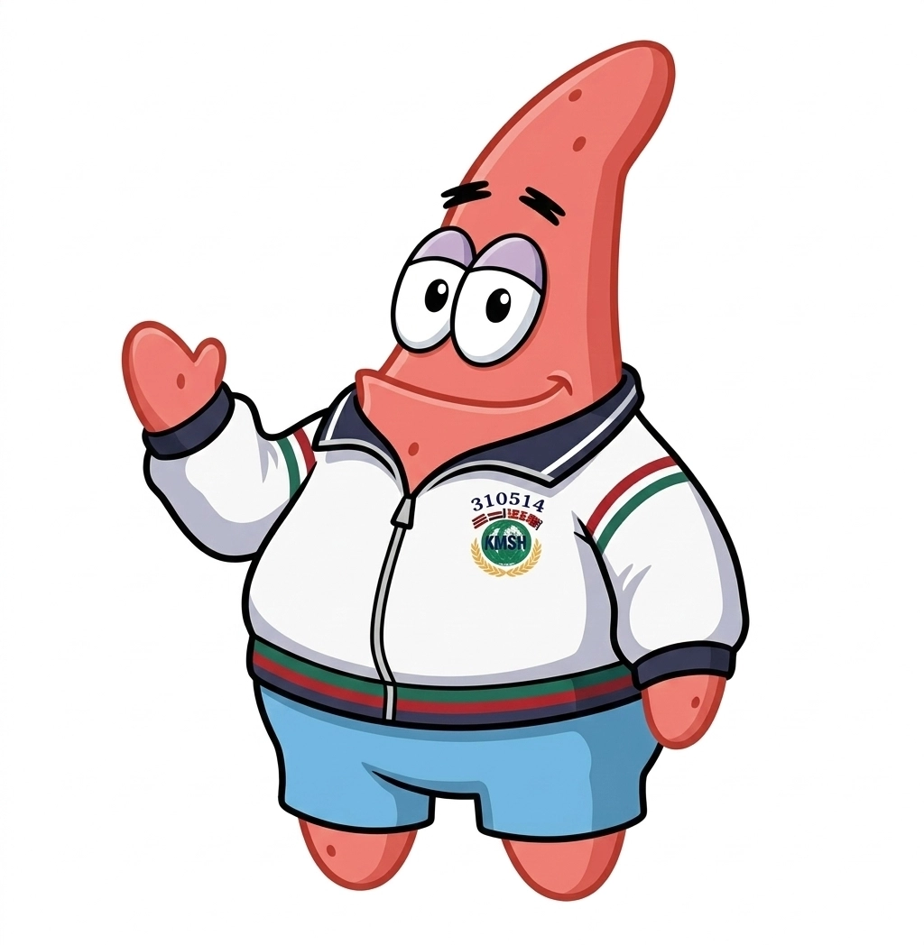 幫我把這張圖片生成成一位立體的派大星,他幻想自己是一位高中的校長,鎮定地站在司令台(就是立體公仔的底