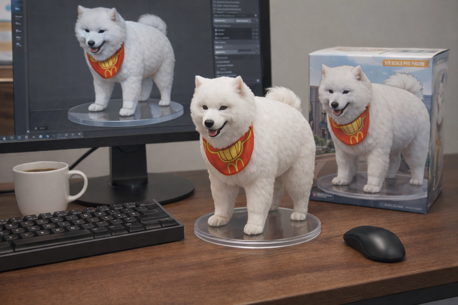 請用我提供的原圖,把圖片內主體變成電腦桌前的立體公仔。場景為一張電腦書桌,上面擺放著一個1/7比例的