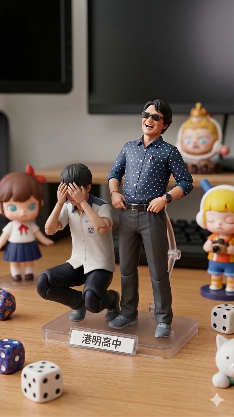 「請用我提供的原圖,把圖片內主體變成電腦桌前的立體公仔。場景為一張電腦書桌,上面擺放著一個1/7比例