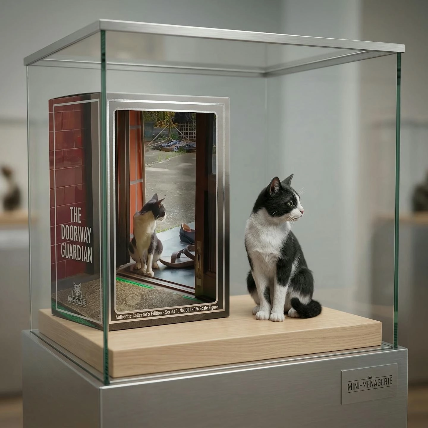 指令:畫面中的貓生成成一個模型公仔的樣子,並在其旁邊有對應的包裝盒,背景在一個玻璃展示櫃內Ai能自動