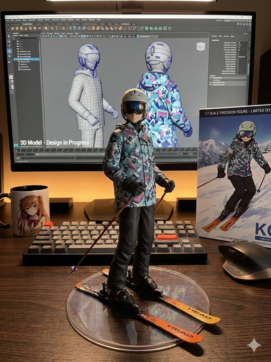 請用我提供的原圖,把圖片內主體變成電腦桌前的立體公仔。場景為一張電腦書桌,上面擺放著一個1/7比例的
