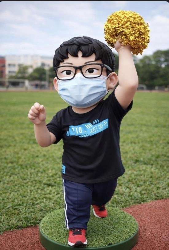 生成這個人在操場草地加油的公仔的圖片第1張照片是生成圖第2張是原圖