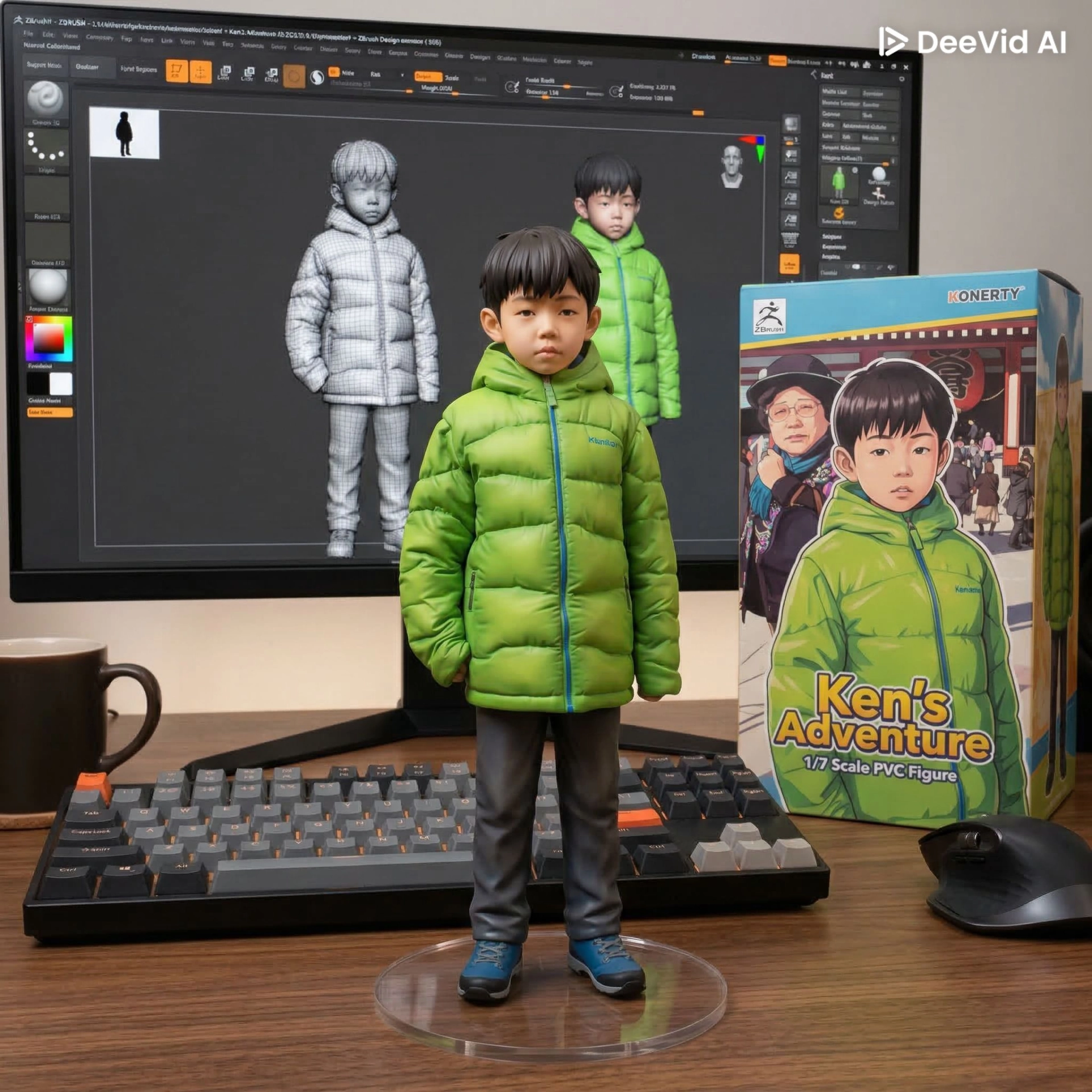 請用我提供的原圖,把圖片內主體變成電腦桌前的立體公仔。場景為一張電腦書桌,上面擺放著一個1/7比例的