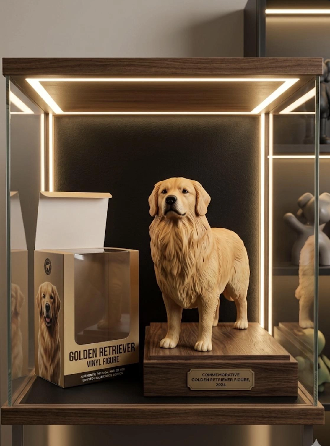 請將圖片都狗做成一個公仔,場景為展示櫃裡,展示櫃有燈條,旁邊有公仔的盒子