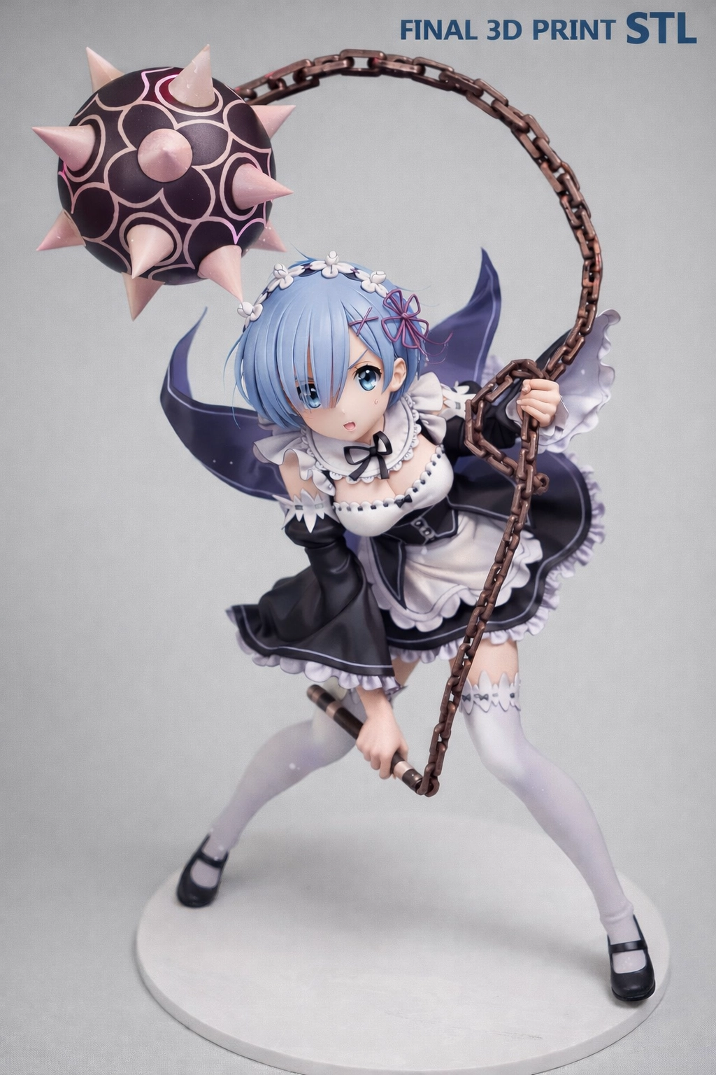 請生成Re0人氣動漫女主角雷姆,並生成3D模型,流星錘顏色要用淡粉紅