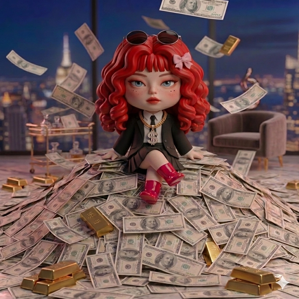 幫我做成可愛公仔要精緻可愛像玩具把頭留著比例差不多整個人縮小一點看起來很有錢的感覺嘻哈感帶一個黑色圓