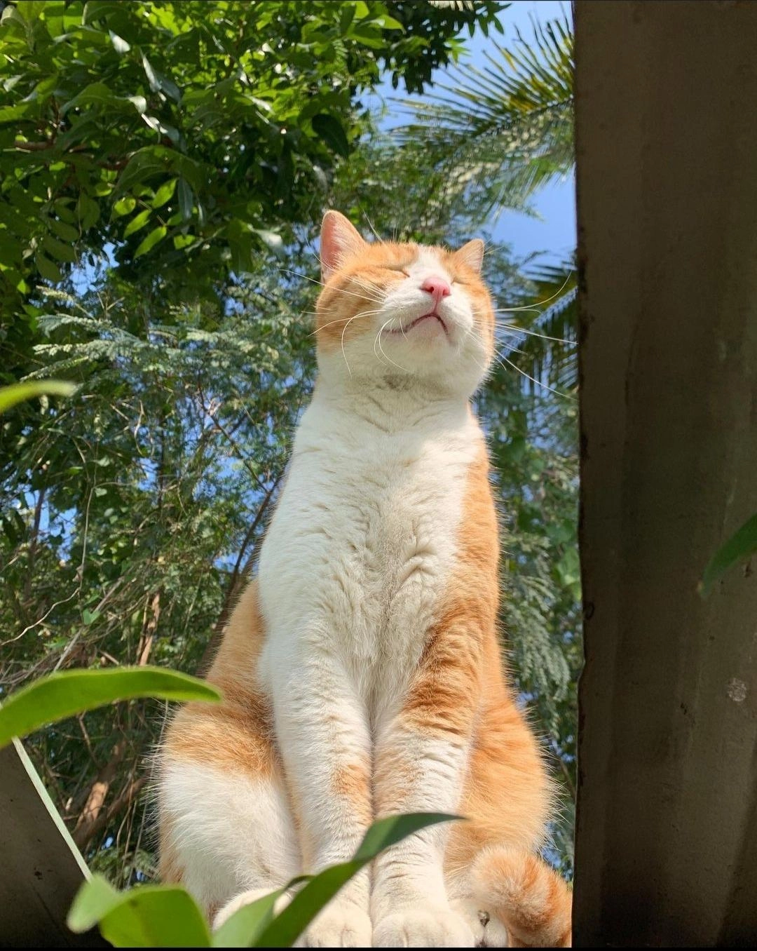 使用AI生成指令:請幫我將圖片中的貓咪生成成公仔。這是一張由下往上仰拍的橘貓照片,它在陽光下瞇著眼享