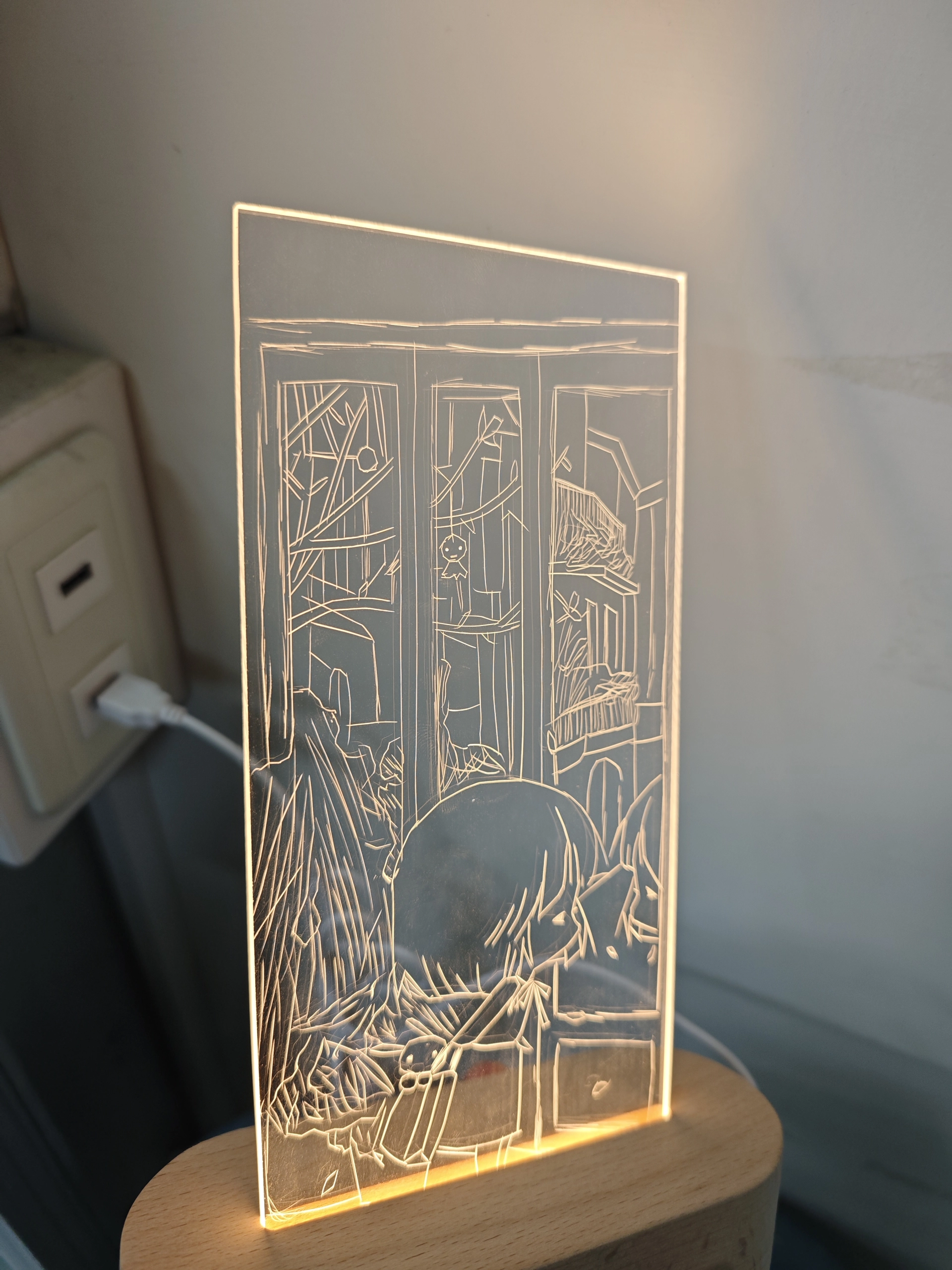 這件壓克力燈飾以手繪線條刻畫出溫馨的場景:一位小女孩在窗前凝望,周圍細節以簡潔的線描呈現,透過光線投