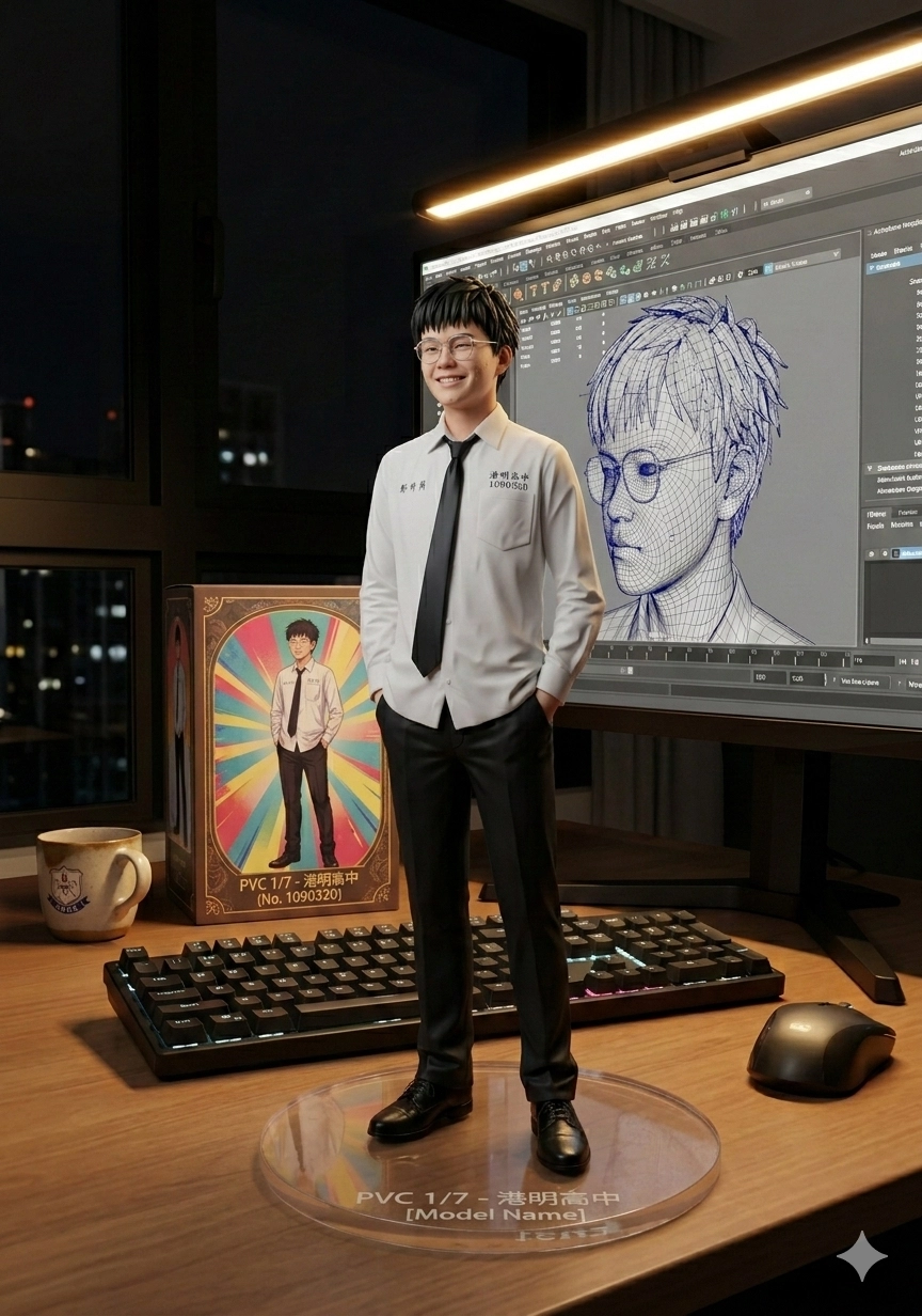 請用我提供的原圖,把圖片內主體變成電腦桌前的立體公仔。