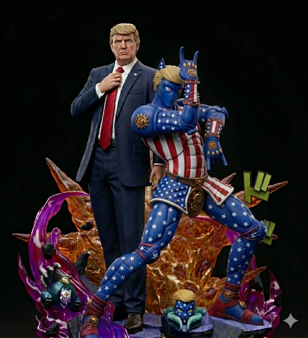 3. 在現在的基礎上,把前面的「紫色人」的配色改爲跟川普衣服相像的配色(90%藍、5%紅、5%白),最後為它加上一個跟川普相像的金髮