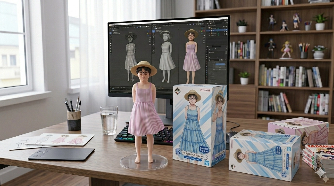在公仔的背後是一台電腦螢幕,螢幕上顯示該角色的 3D 設計圖,就像有人正在進行設計過程。讓公仔穿著連身洋裝,帶著圓形的遮陽帽