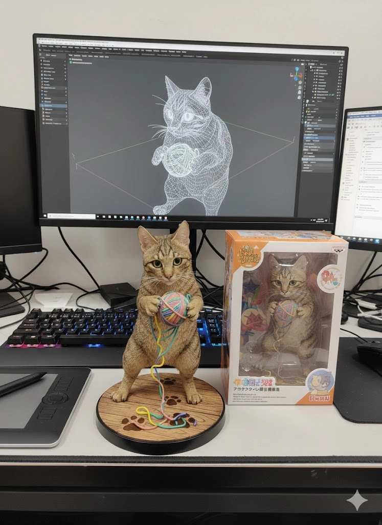 請用我提供的原圖,把圖片內主體變成電腦桌前的立體公仔。公仔動作為貓咪抓著毛線球玩