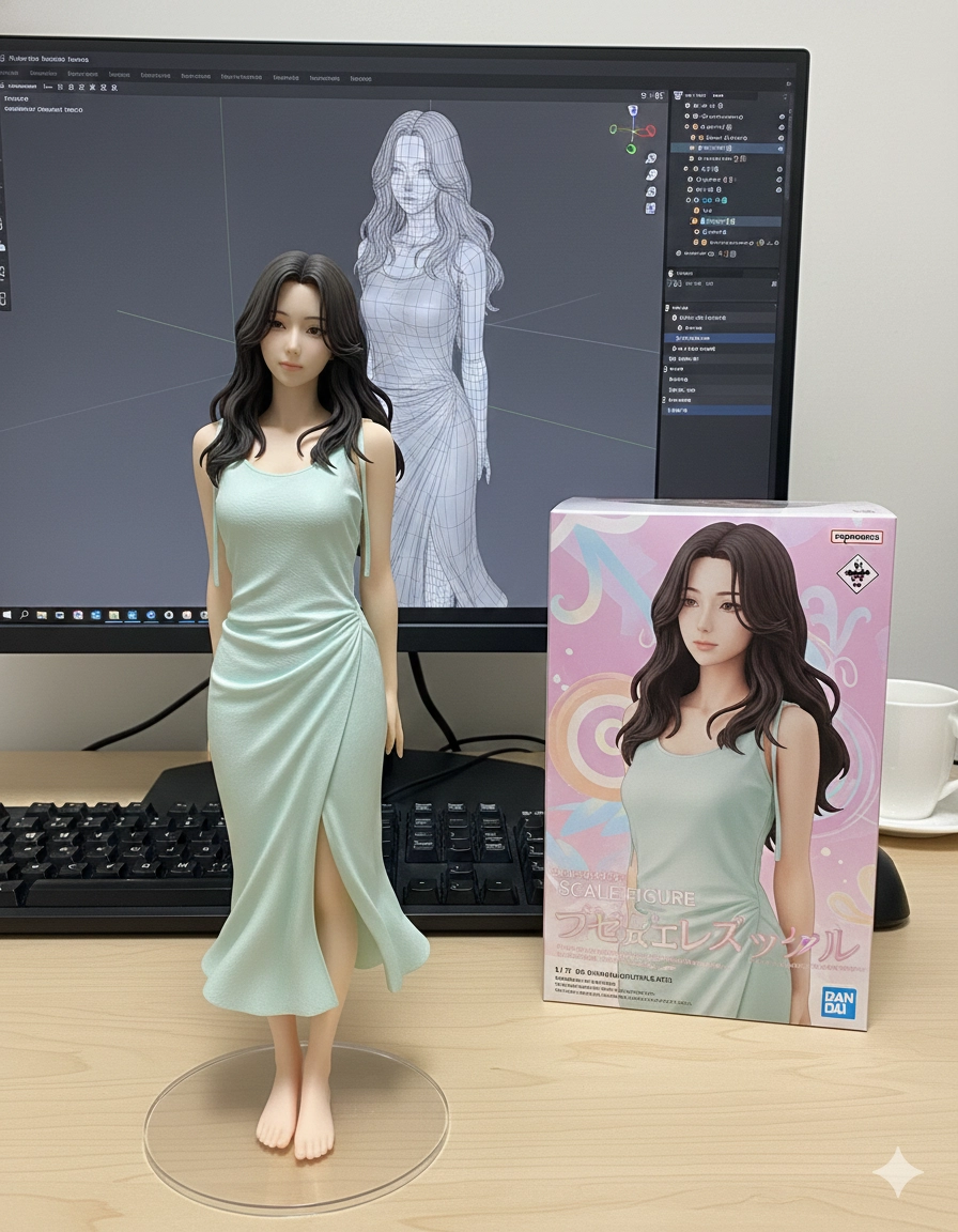 桌面上另外放置了鍵盤、咖味杯,以及其模型盒,設計為市售收藏品風格,正面印有該角色的彩色動漫插圖,呈現完整的週邊商品氛圍。」