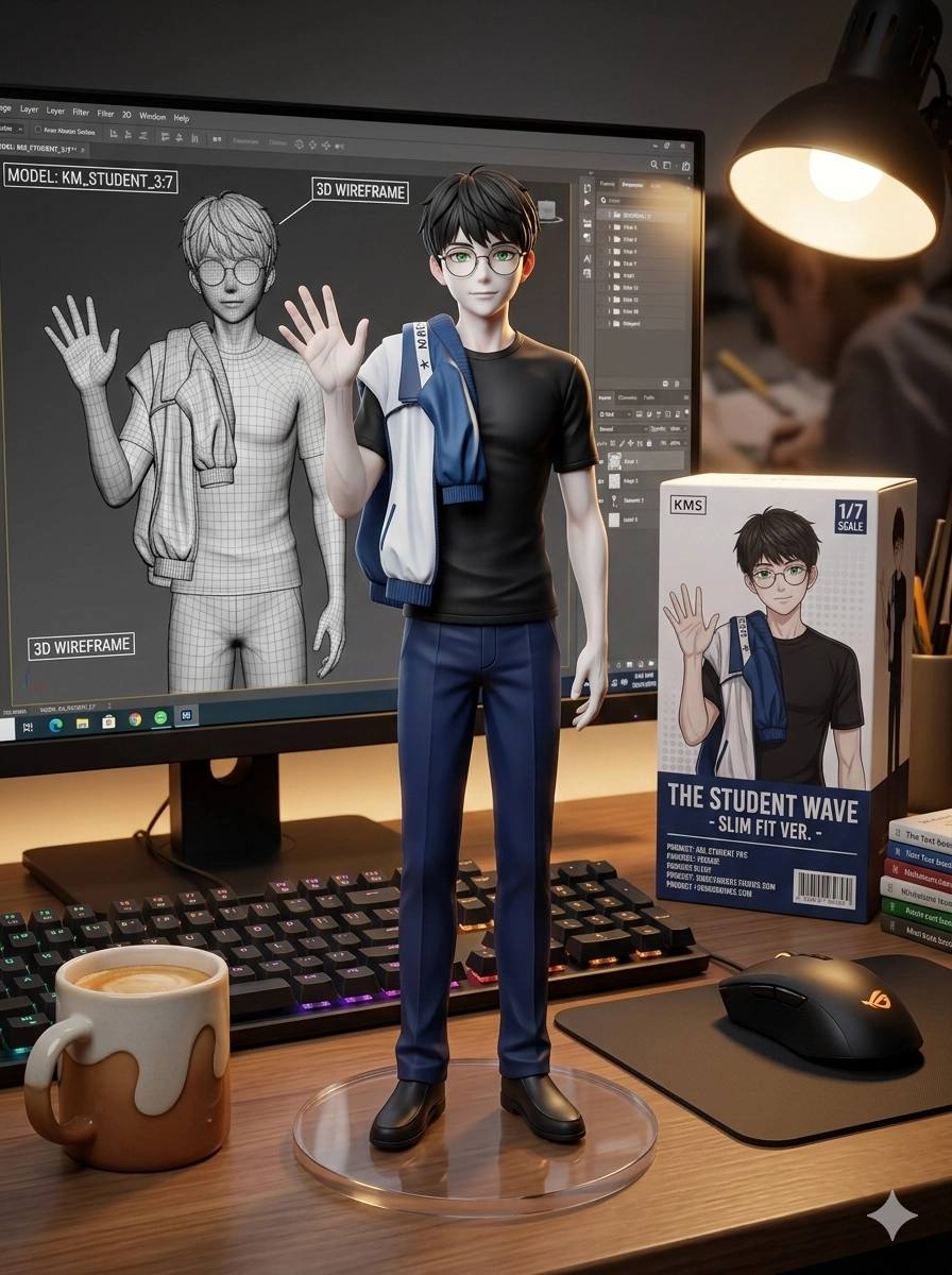 請用我提供的原圖,把圖片內主體變成電腦桌前的立體公仔。 同學再瘦一點,然後要有薄肌感,皮膚再白一點,眼瞳改成綠色,手有若隱若現的青筋,身體比例為身3腿7 場景為一張電腦書桌,上面擺放著一個1/7 比例的 PVC 公仔,角色以站立姿態呈現,並固定在透明圓形底座上,呈現出細緻逼真的動漫風格收藏品質感。 在公仔的背後是一台電腦螢幕,螢幕上顯示該角色的 3D 設計圖,就像有人正在進