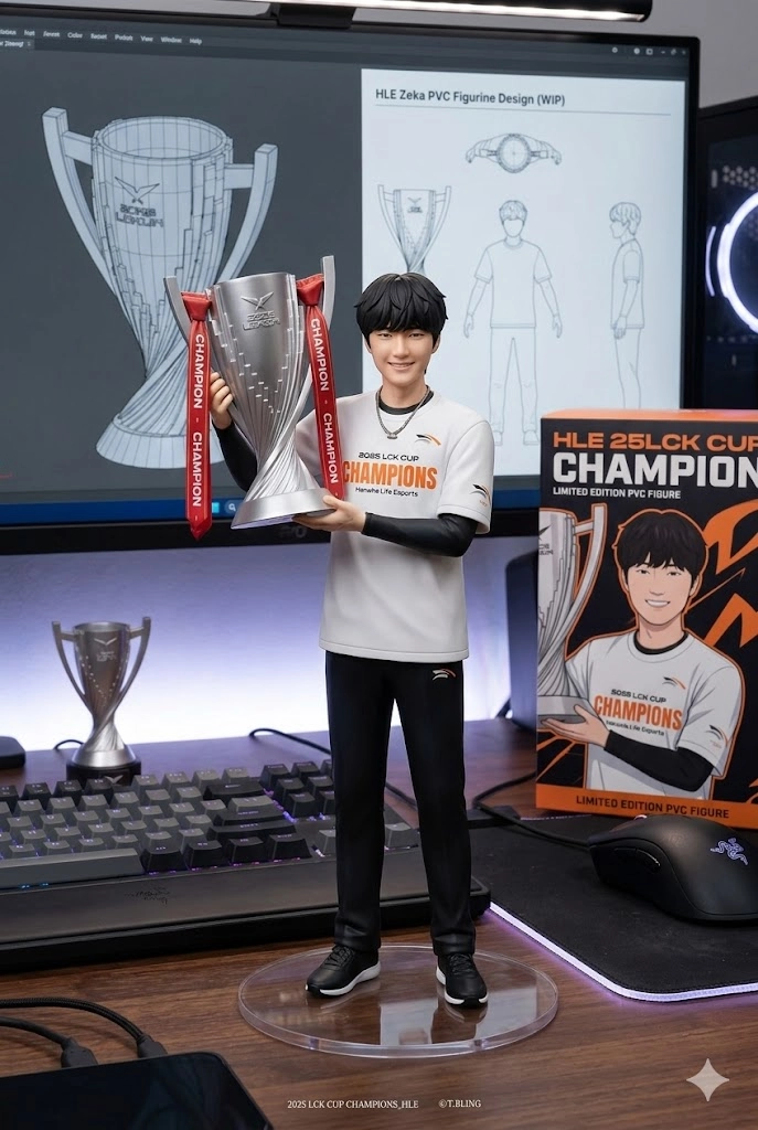 桌面上另外放置了鍵盤、滑鼠、小獎盃以及其模型盒(橘黑白顏色為主),設計為市售收藏品風格,正面印有該角色的彩色動漫插圖(並寫上HLE 25LCK CUP CHAMPION),呈現完整的周邊商品氛圍。