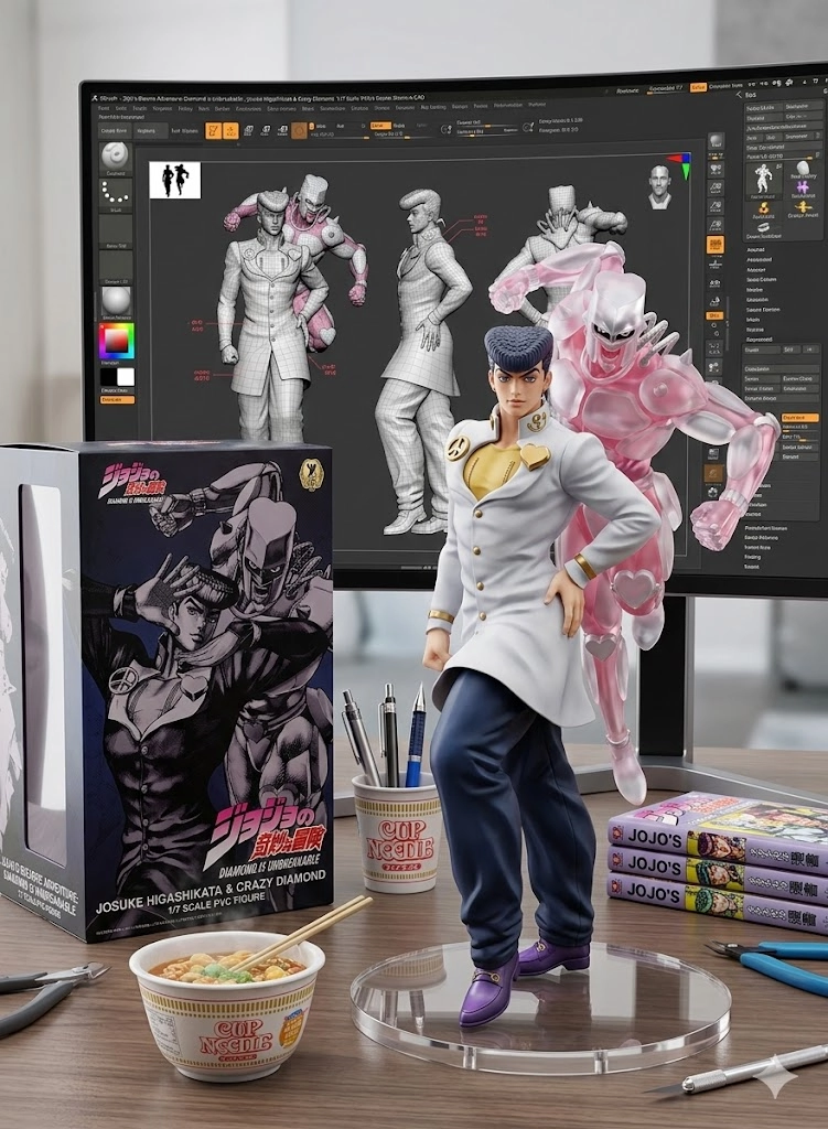 桌面上另外放置了泡麵,鋼珠筆和漫畫書,以及其模型盒,設計為市售收藏品風格,正面印有該角色的暗色立體感插圖,呈現完整的周邊商品氛圍。」