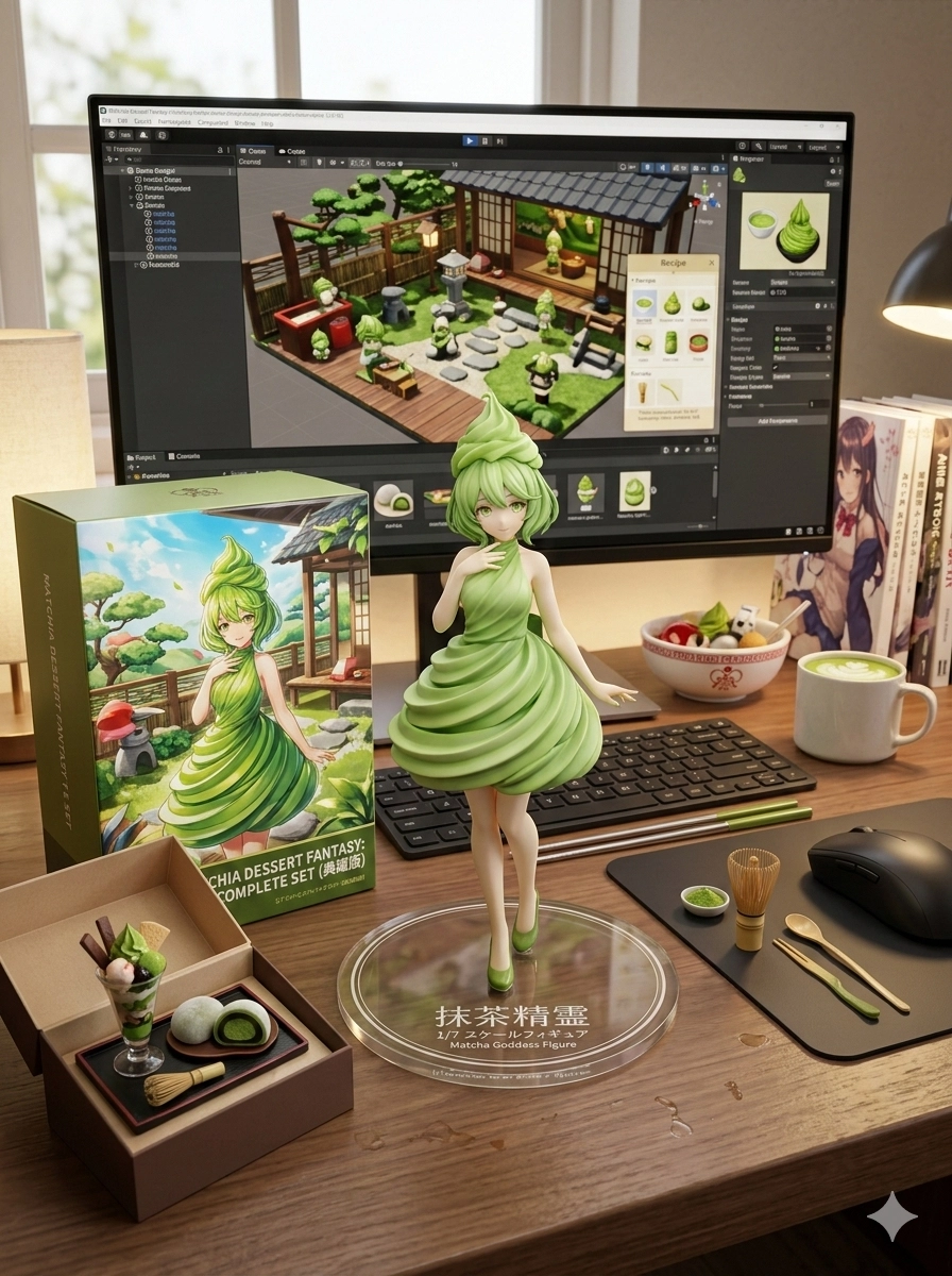 桌面上另外放置了各式各樣甜點有關物品,以及其模型盒,設計為市售收藏品風格,正面印有該角色的亮色立體感插圖,呈現完整的周邊商品氛圍。」