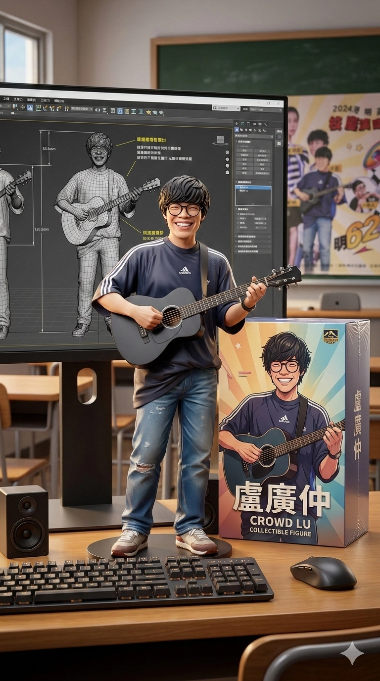 請用我提供的原圖,把圖片內主體變成電腦桌前的立體公仔。場景為一張教室書桌,上面擺放著一個1/7 比例的 PVC 公仔,角色以站立姿態呈現上,呈現出細緻逼真的風格收藏品質感。