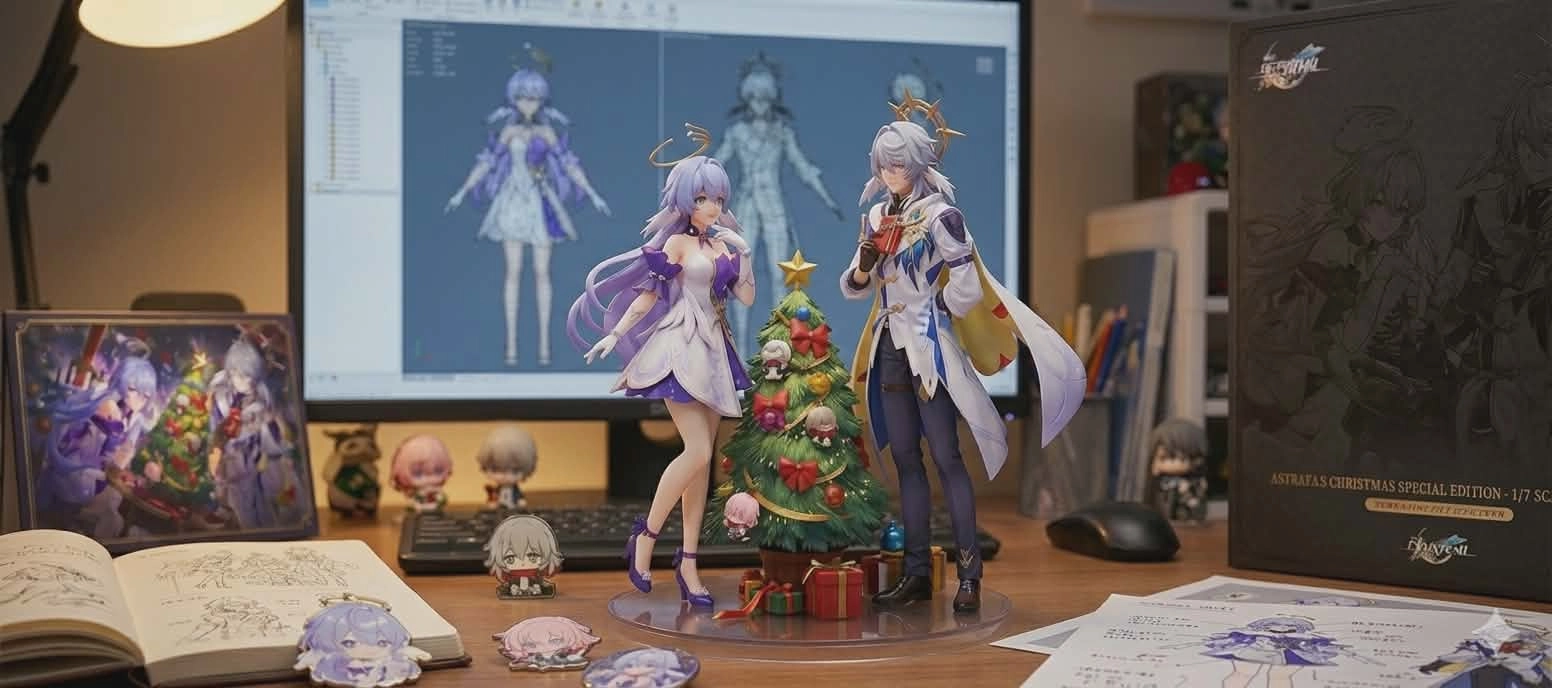 桌面上放著印有兩人圖片的筆記本,徽章和一些草稿圖片,以及公仔的模型盒,設計為市售收藏品風格,正面有暗色立體感插圖,呈現完整的周邊商品氛圍,鏡頭稍微拉近,然後中間公仔要成為照片主角。