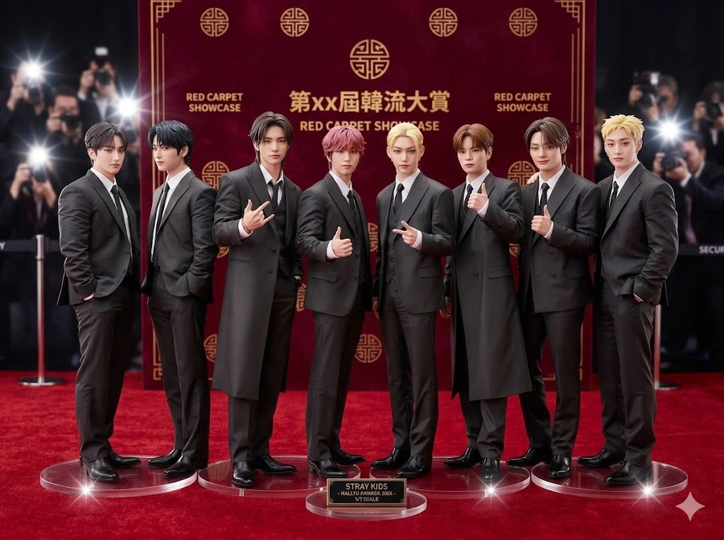 2.輸入: 請用我提供的原圖,把圖片內主體變成站在紅毯上走秀的立體公仔。 場景為在韓國頒獎典禮紅毯上,上面擺放著八個 1/7 比例的 PVC 公仔,角色以站立姿態呈現,並固定在透明圓形底座上,呈現出細緻逼真的動漫風格收藏品質感。 在公仔的背後是一片深紅色的背景版,臉上可以有一點光營造出正在被拍攝,有閃光燈照在臉上的感覺。(第二張-由Gemini生成)