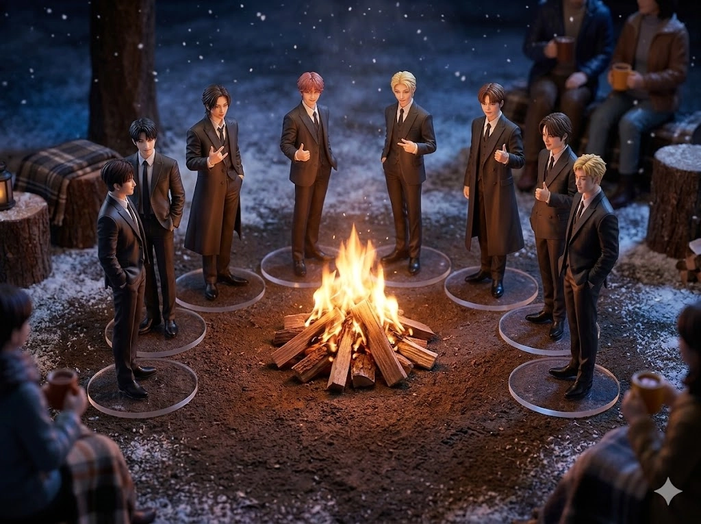 3.輸入: 請用我提供的原圖,把圖片內主體變成圍成一圈的立體公仔。 場景為在營火晚會上,擺放著八個 1/7 比例的 PVC 公仔,角色以站立姿態呈現,並固定在透明圓形底座上,呈現出細緻逼真的動漫風格收藏品質感。 在公仔所圍成的圈的中間是正在燃燒的柴火,天空飄著一點雪花,營造出溫馨的氛圍。(第三張-由Gemini生成)