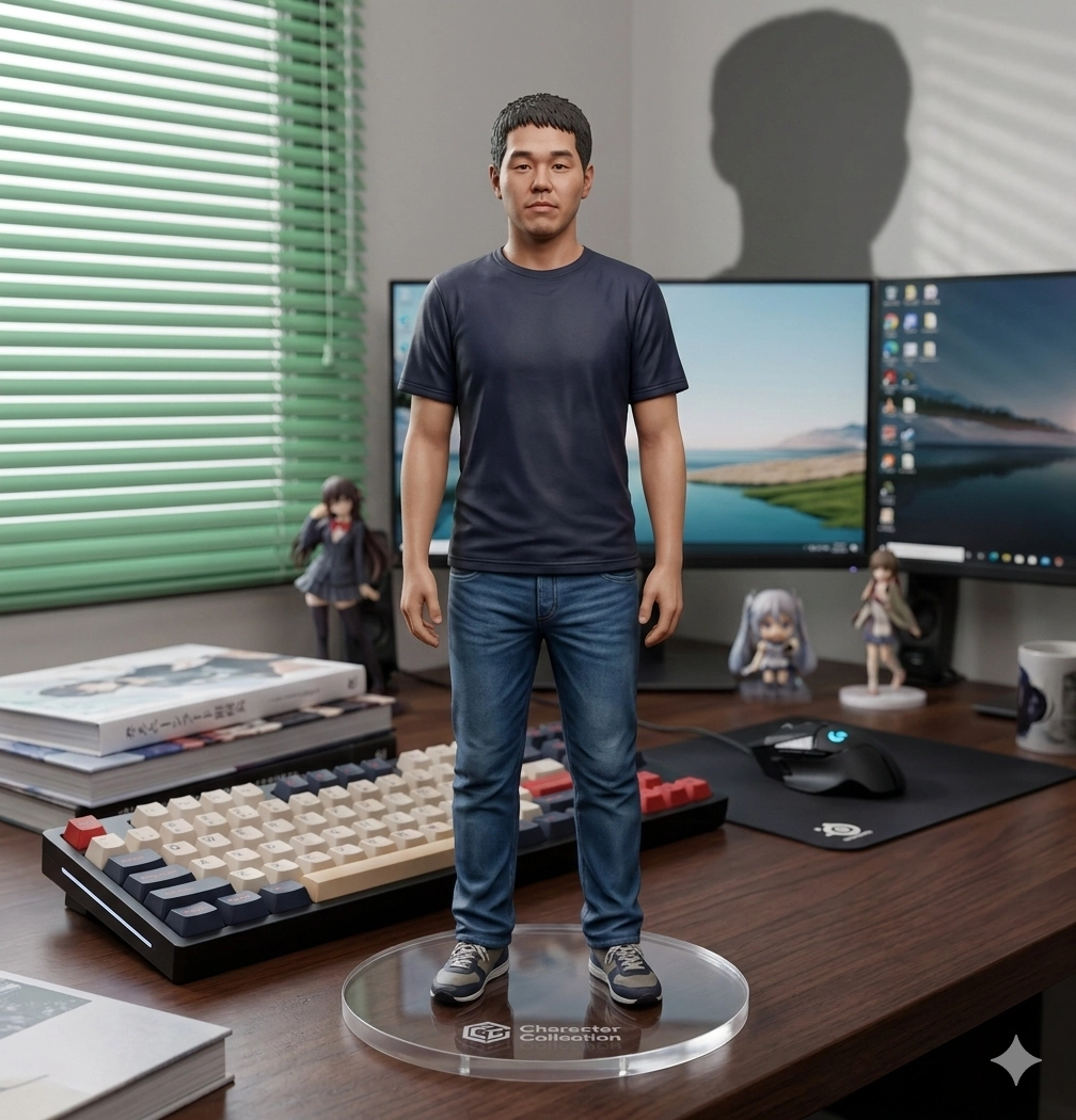 請用我提供的原圖,把圖片內主體變成電腦桌前的立體公仔。場景為一張電腦書桌,上面擺放著一個1/7比例的