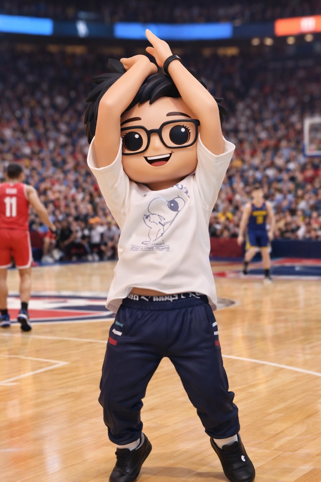 幫我把這張照片做成公仔背景設成籃球場動作不變衣服也不變