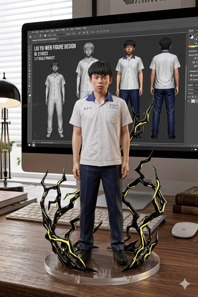 請用我提供的原圖,把圖片內主體變成電腦桌前的立體公仔。