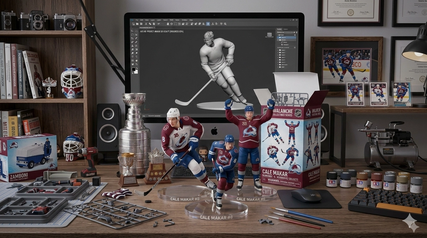 場景為一張電腦書桌,上面擺放著幾個1/7 比例的 PVC 公仔,角色以圖中的Cale Makar 為主,呈現不同動作(類似盲盒有多種款式),並固定在透明圓形底座上,呈現出細緻逼真的動漫風格收藏品質感。