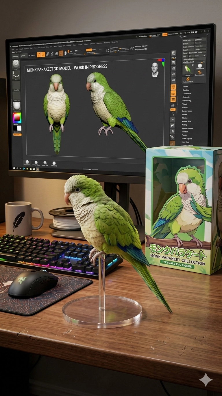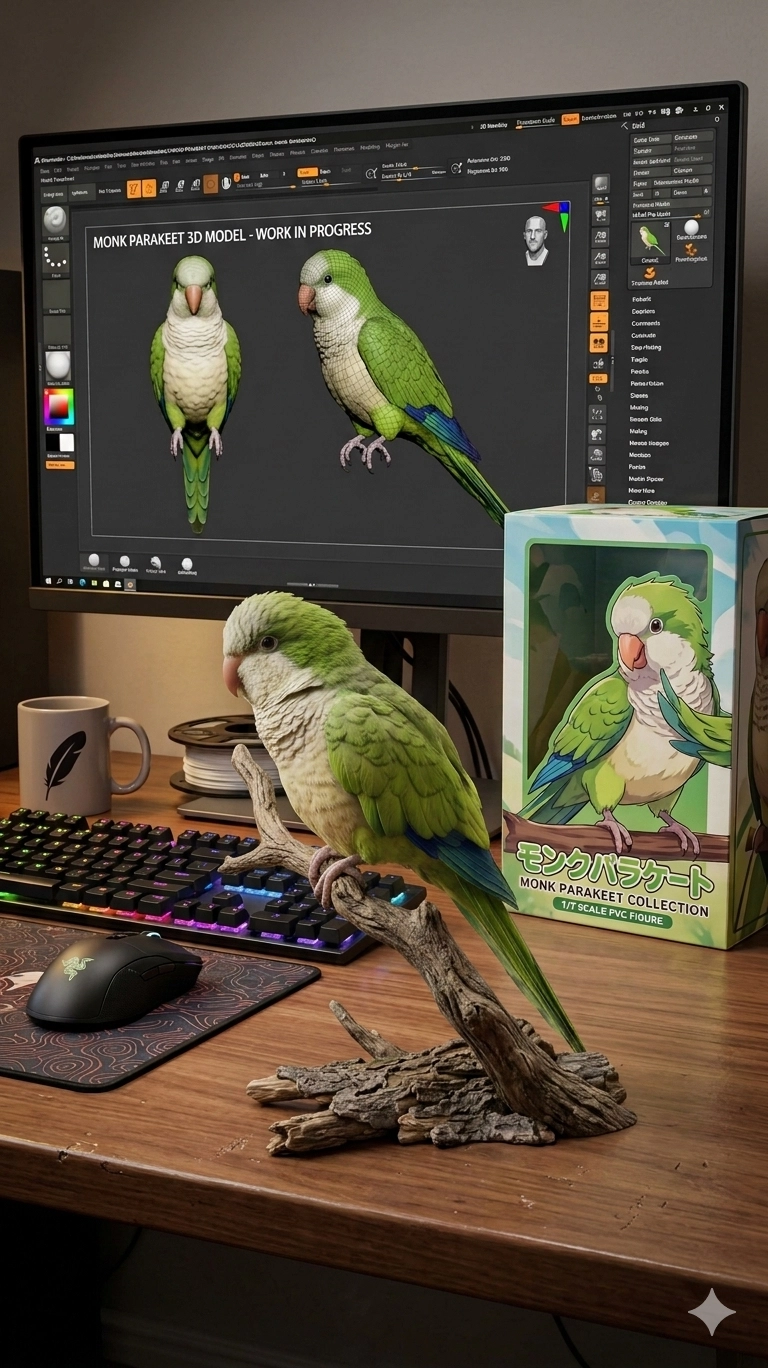 首次嘗試,鳥的腳下踩的是塑膠支架,看起來廉價、生硬,再次嘗試之後應要求改成樹枝,看起來活潑許多,如同