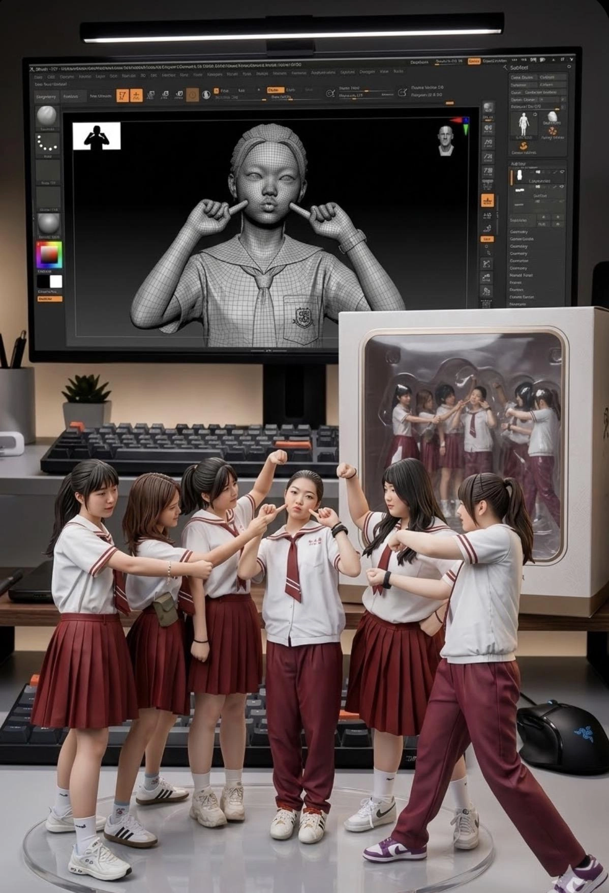 製作一款1/7比例的商業化角色模型,以寫實風格呈現,並置於真實環境中。模型放在電腦桌上,底座為圓形透明壓克力,且底座上沒有任何文字。電腦螢幕畫面顯示的是此模型在ZBrush中的建模過程。在電腦螢幕旁,擺放著一個帶有圓角設計的包裝盒,正面有透明視窗,可以清楚看到裡面的模型。」