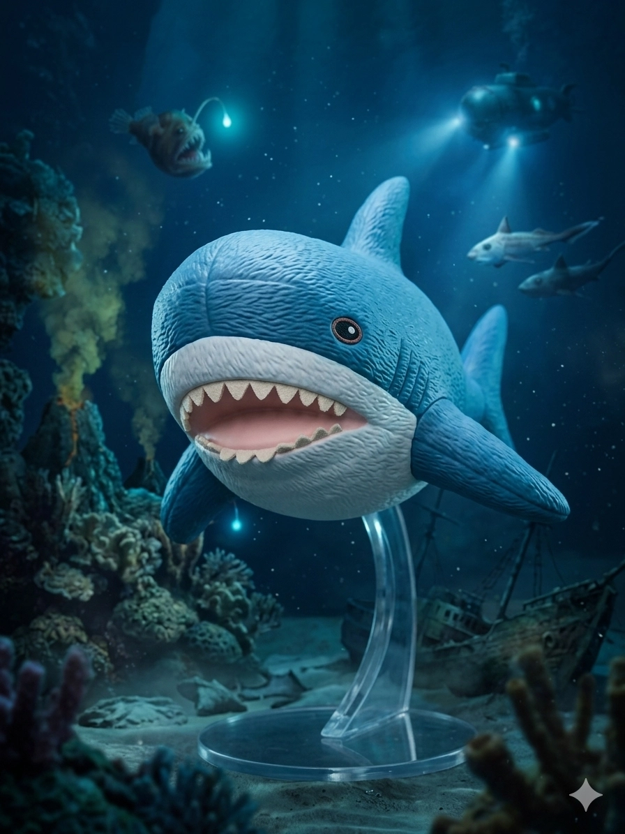 請幫我生成一個公仔,我的要求是要表現出鯊魚兇猛和可愛的反差,背景生成是深海中的環境