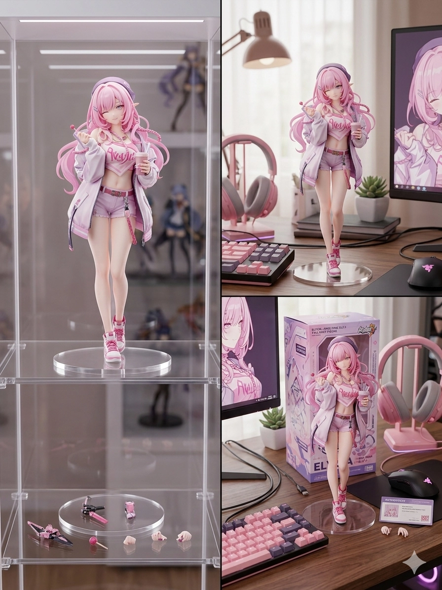 第二個場景為一張電腦書桌,角色以站立姿態呈現,並固定在透明底座上,呈現出細緻逼真的動漫風格收藏品質感。