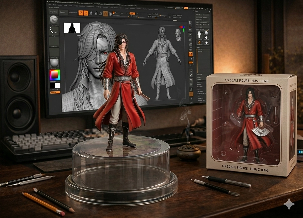 製作一款1/7比例的商業化角色模型,以寫實風格呈現,並置於真實環境中。模型放在電腦桌上,底座為圓形透明壓克力,且底座上沒有任何文字。電腦螢幕畫面顯示的是此模型在ZBrush中的建模過程。在電腦螢幕旁,擺放著一個帶有圓角設計的包裝盒,正面有透明視窗,可以清楚看到裡面的模型。