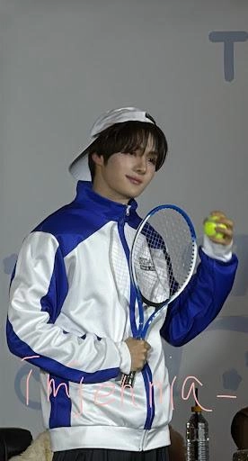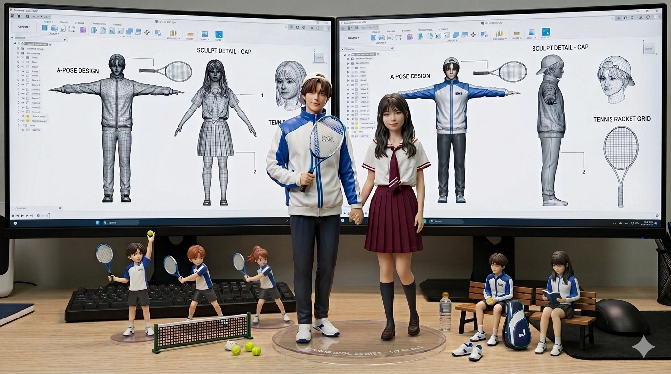場景為一張電腦書桌,上面擺放著一個 1/7 比例的 PVC 公仔,請打造網球idol風格,並固定在透明圓形底座上,呈現出細緻逼真的動漫風格收藏品質感。