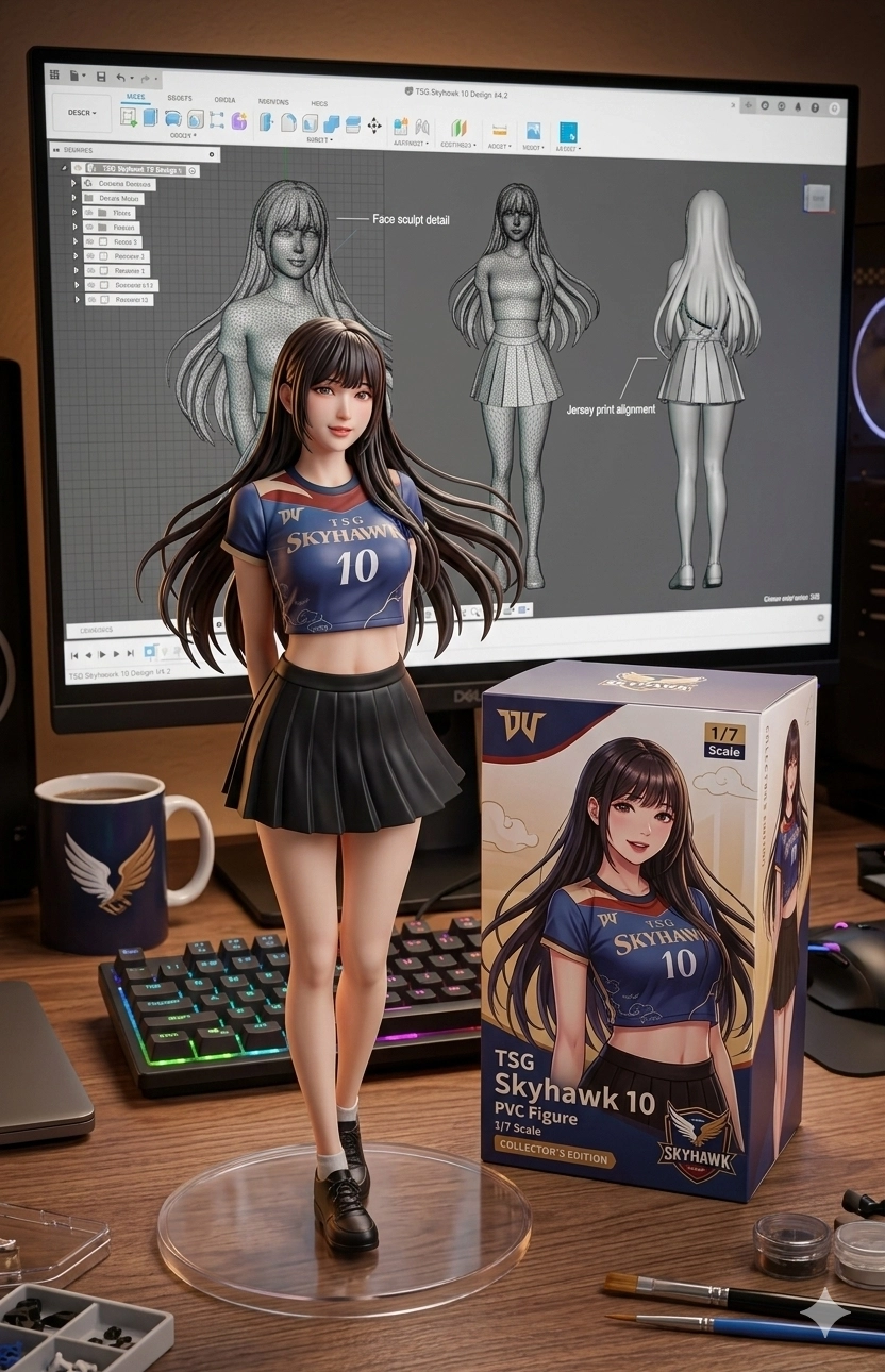 請用我提供的原圖,把圖片內主體變成電腦桌前的立體公仔。