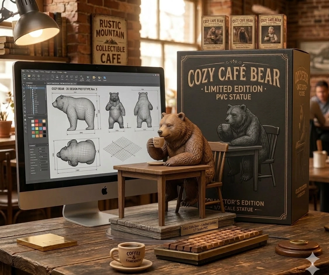 場景為一張電腦書桌,上面擺放著一個 1/7 比例的 PVC 公仔,場景為一間咖啡廳,上面擺放著一個熊公仔,呈現牠正悠閒的趴在桌上享受著安靜的時光,並固定在木頭小椅子上,呈現出鄉村風格的氛圍並固定在透明圓形底座上,呈現出細緻逼真的動漫風格收藏品質感。