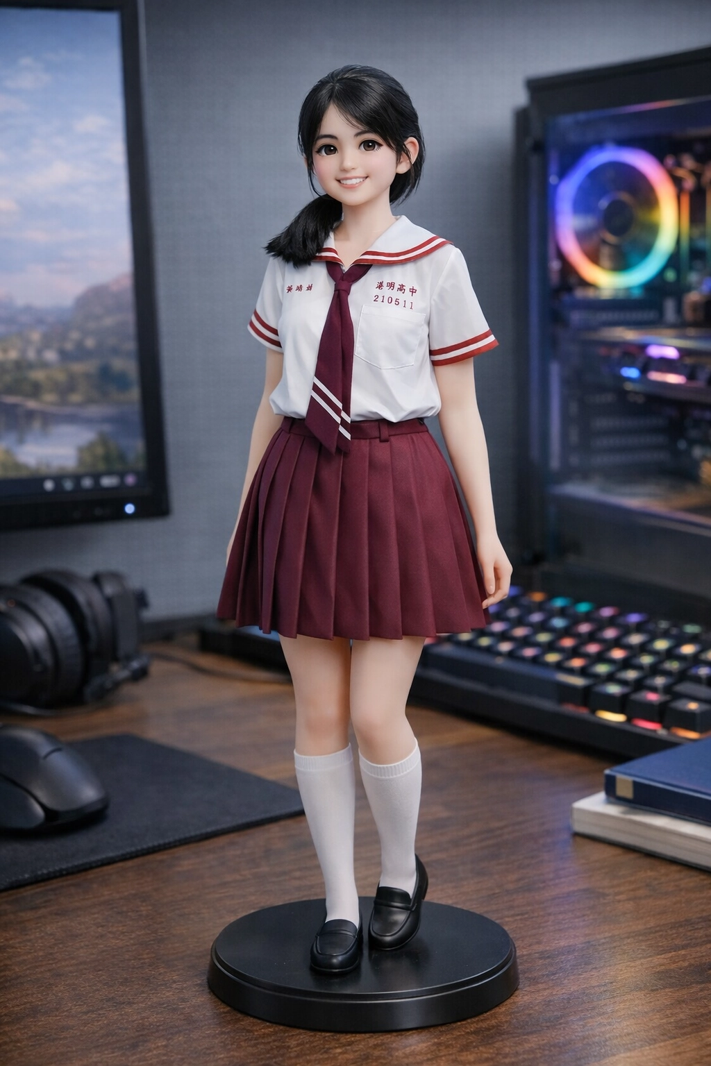 本作品以提供的人物照片為基礎,將真實人物轉化為一尊具有立體感的桌面公仔。公仔保留了原本的學生制服元素與溫和的微笑表情,透過比例與材質的轉換,呈現出可愛且精緻的模型質感,使人物彷彿成為一件收藏級的藝術公仔。人物站立於圓形底座上,姿態自然,展現青春與活力。