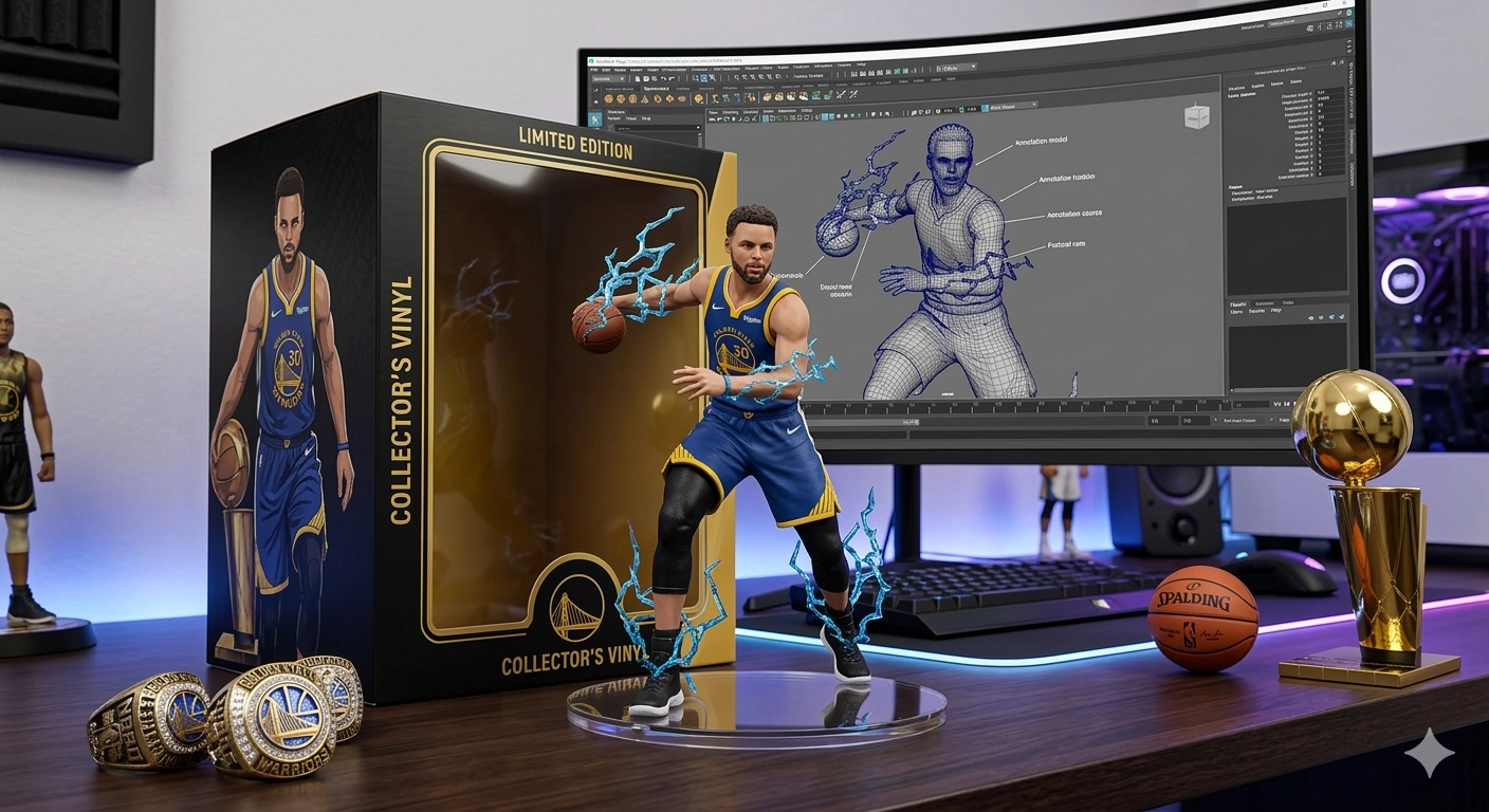 桌面上另外放置了nba勇士隊冠軍戒指、籃球、nba冠軍獎盃,以及其模型盒,設計為市售收藏品風格,正面印有該角色的暗色立體感插圖,呈現完整的周邊商品氛圍。」