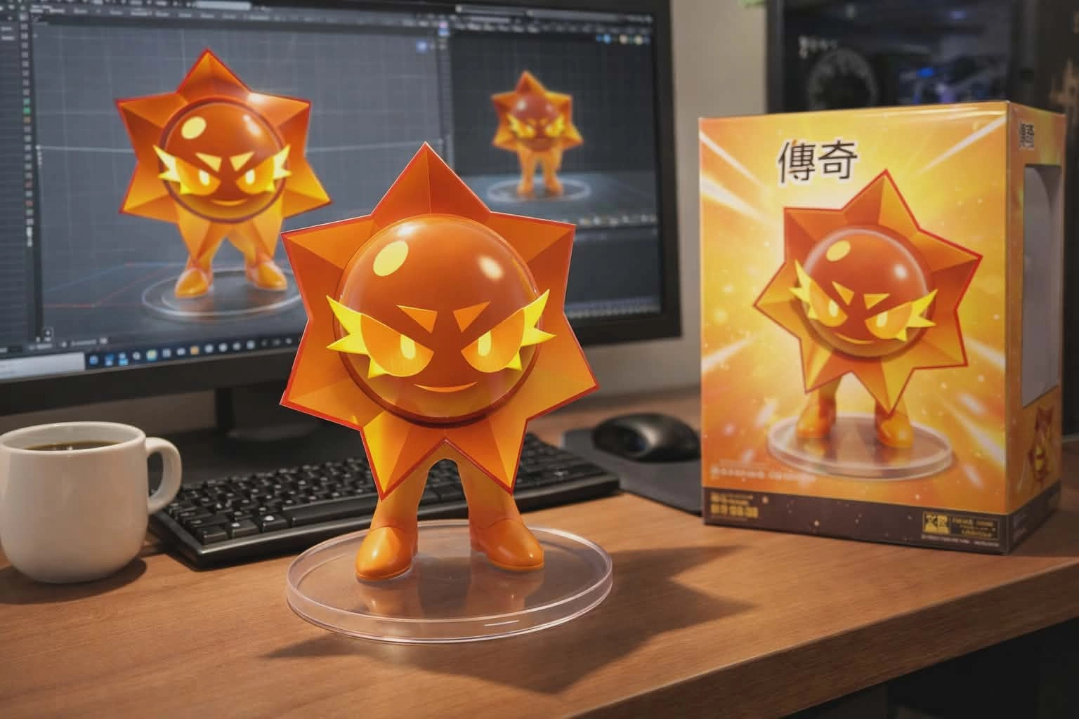 桌面上另外放置了鍵盤、滑鼠、咖啡杯,以及其模型盒,設計為市售收藏品風格,正面印有該角色的彩色動漫插圖,呈現完整的周邊商品氛圍。」