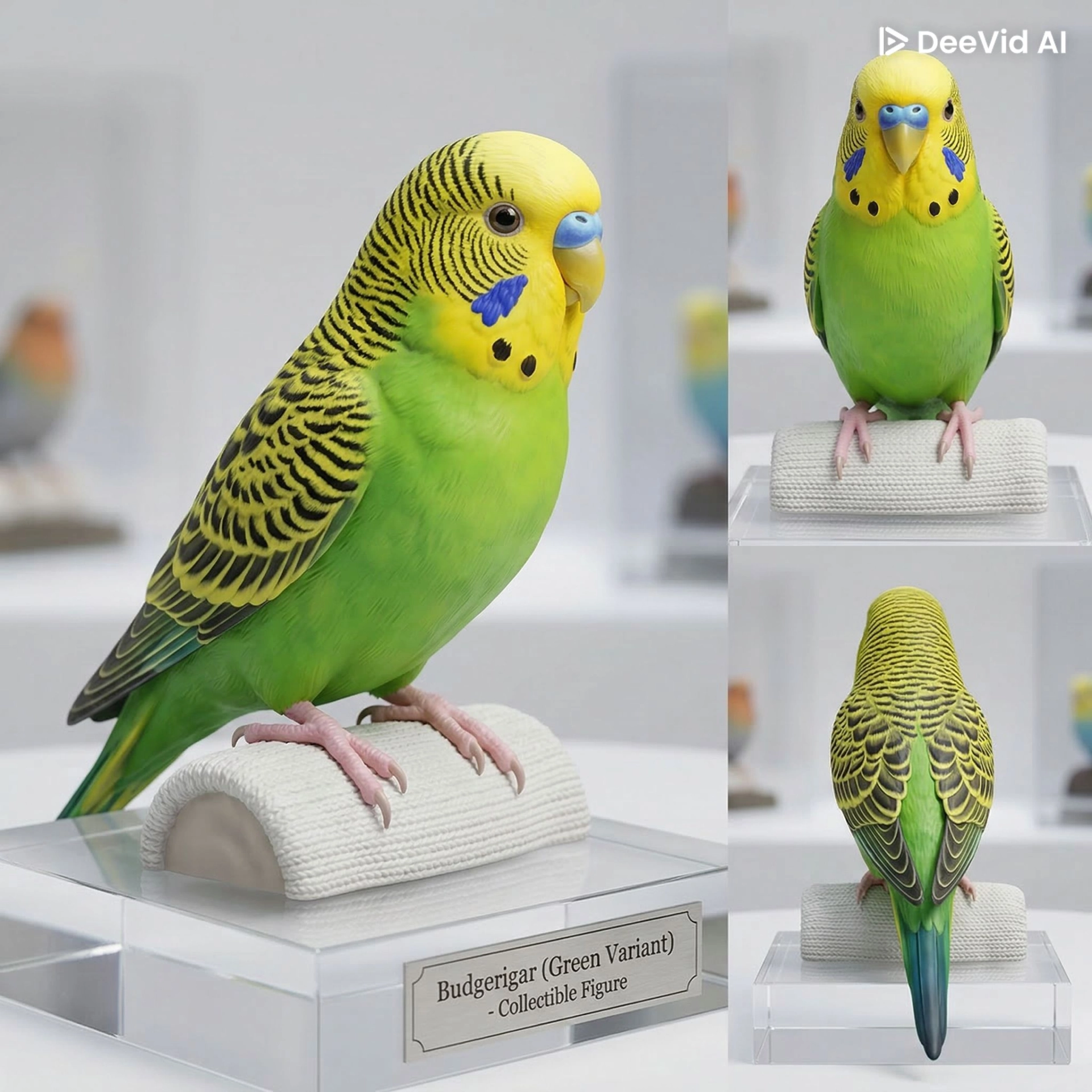 請幫我依照這張照片中的虎皮鸚鵡,生成一個立體的虎皮鸚鵡PVC公仔。