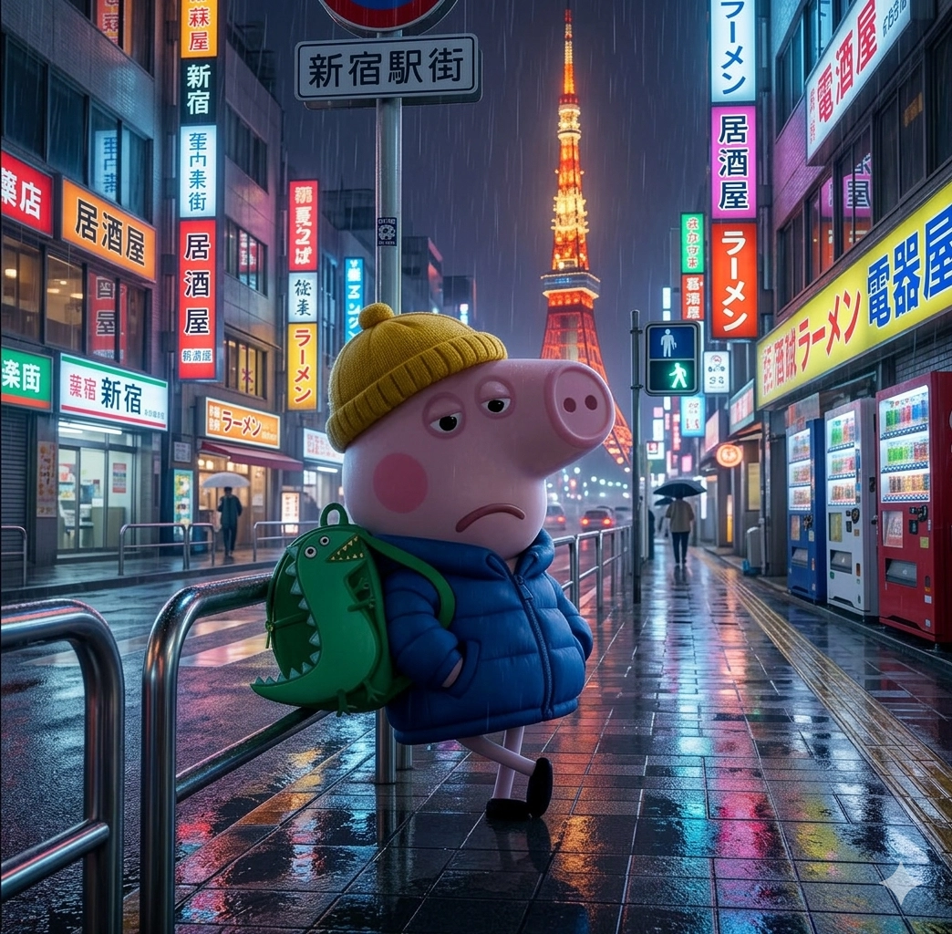 ・地面質感 :強調「濕滑瀝青路 面反射霓虹燈光」,這能讓畫面從原本的憂鬱感增加一點「賽博龐克」 的色彩。・背景圖片:東京著名地標「東京鐵塔」在遠處發出橘紅燈火,背景是充滿霓虹招牌與日文看板的新宿街頭,加上陰雨天濕滑路面反射的五彩霓虹,營造出一種繁華與孤獨並存的疏離感。