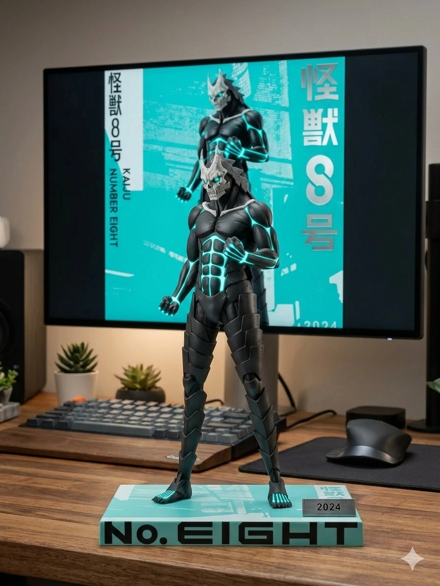1.幫我把人物變成公仔2.把它放上在桌上,後面用螢幕顯示這張圖片