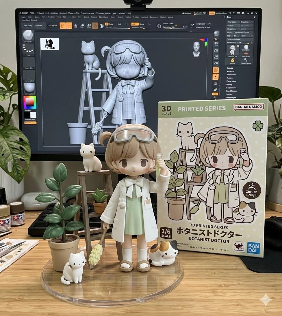 請以這張照片為基礎用3D printing,在真實環境中,創作1/6比例的商品化相片的中的人物模型。模型放置在電腦桌上。